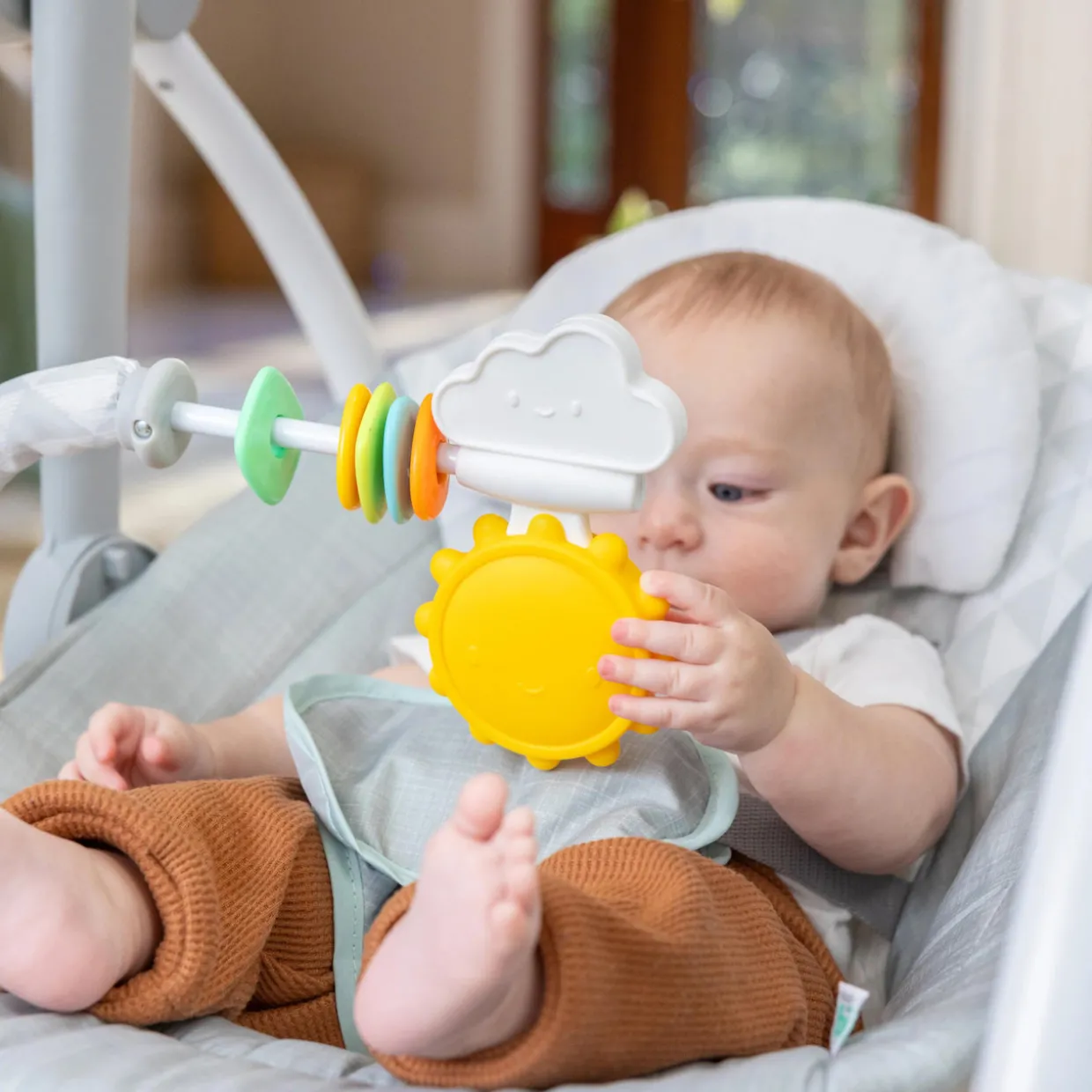 - The swing features 2 grow-with-me toy bars: overhead and lower toy bars offer stimulating toys for baby to play